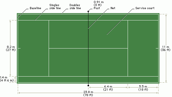 Tenisový dvorec má obdélníkový tvar a rovný povrch. Tenisové hřiště je dlouhé 23,78 m a široké 8,23 m (pro čtyřhru je dvorec široký 10,97 m). Kurt je uprostřed rozdělen sítí zavěšenou ve výšce 0,914 m (měřeno uprostřed), na okraji kurtu má síť výšku 1,07 m. Při čtyřhře je pro hru využíváno postranní rozšíření kurtu.